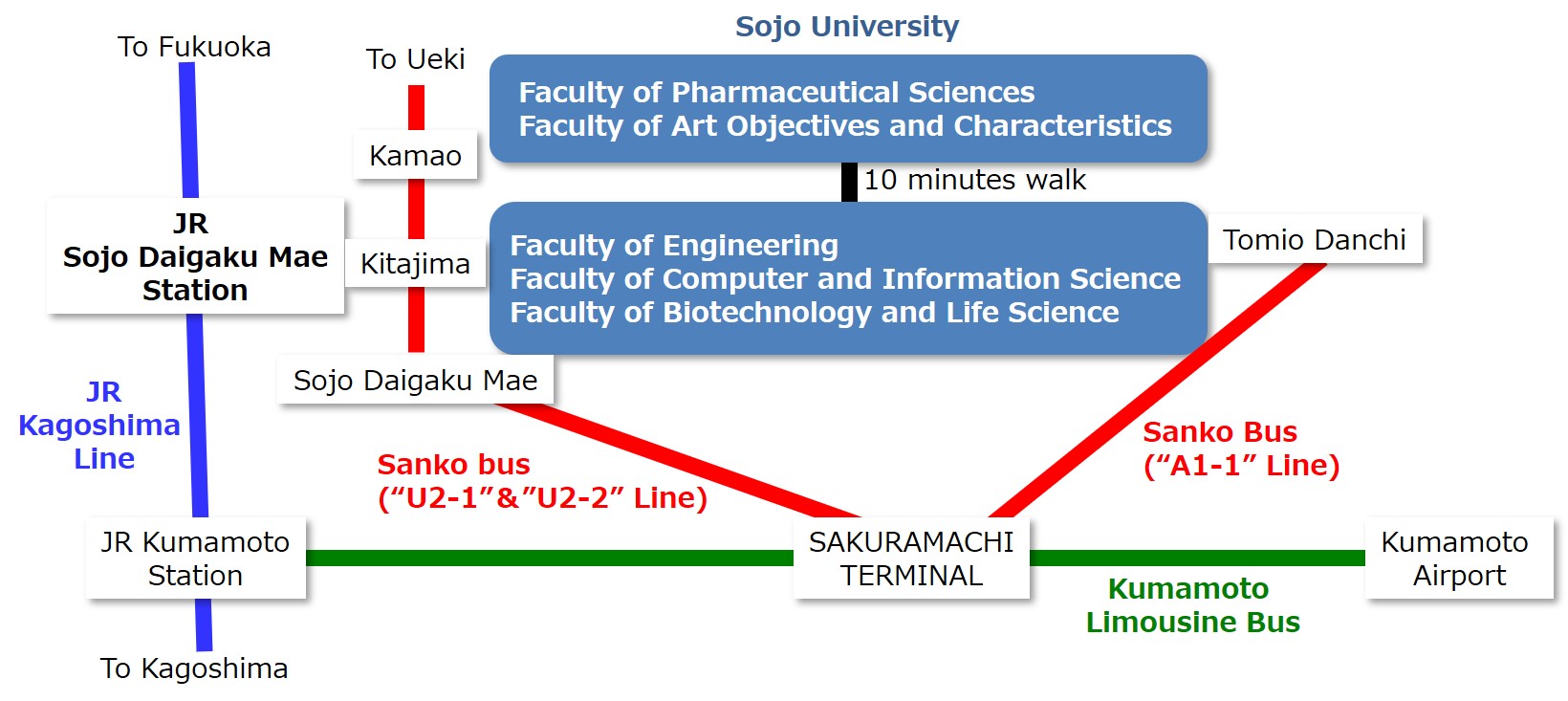 Get off at "JR Sojo Daigaku Mae station" (Please use an incline elevator of the road opposite side from JR station to campus. )