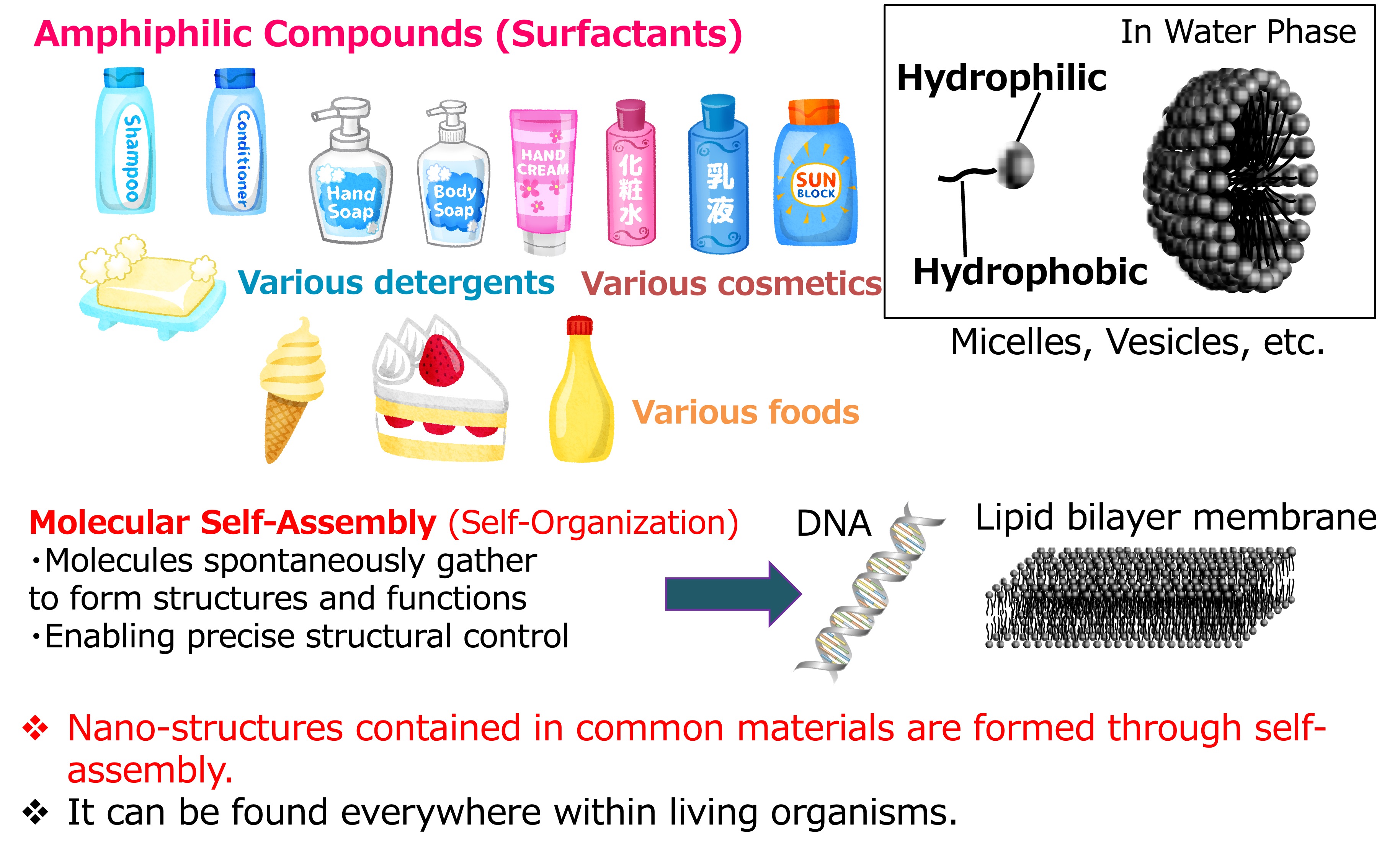 These amphiphilic compounds are not only used in detergents and cosmetics but are also abundant in animals and plants as components of cell membranes, bioactive molecules, and proteins. Our current research theme involves manipulating these compounds inside a beaker and inducing their self-assembly.