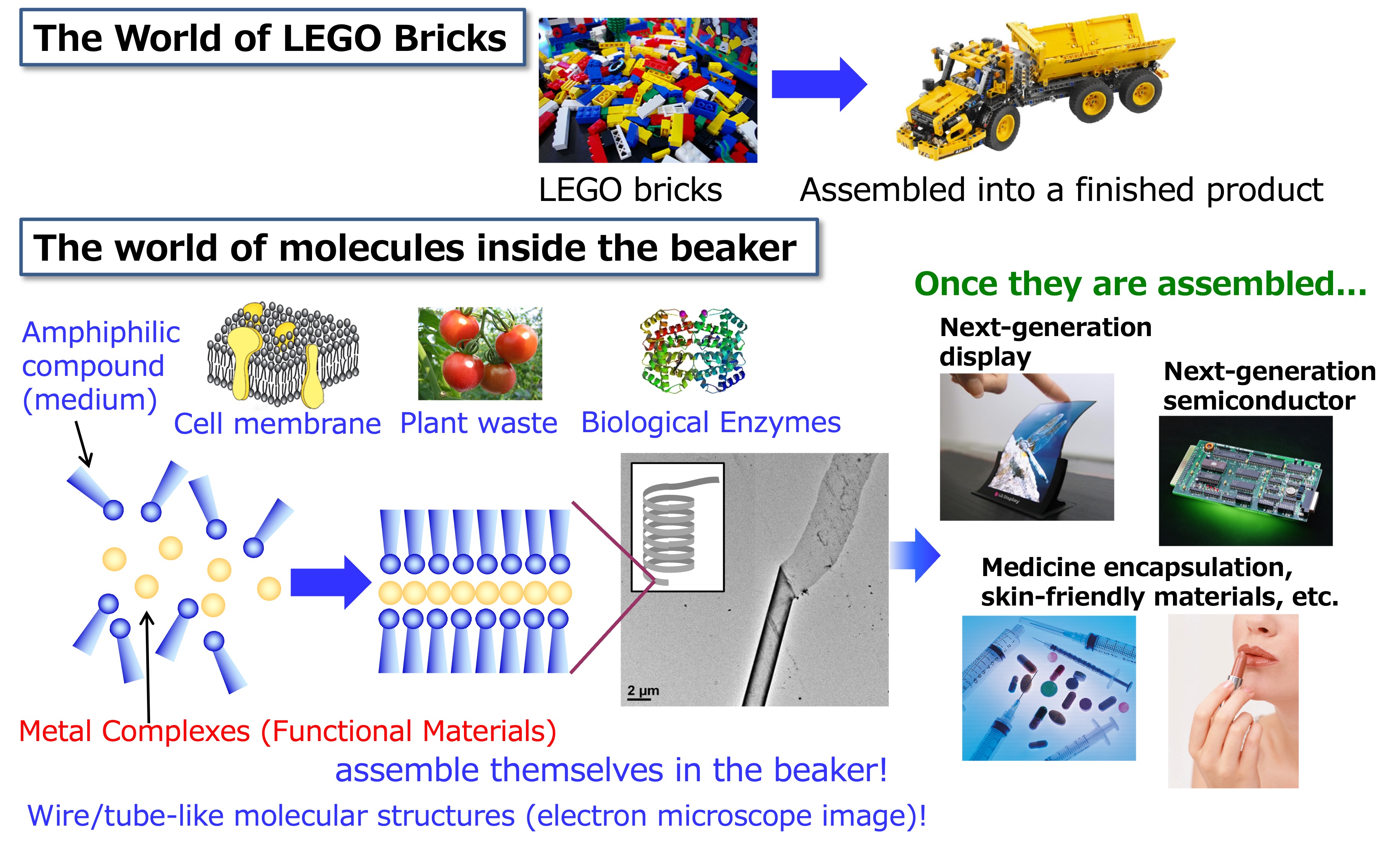Supramolecular hybrids can be thought of as a type of LEGO play using molecular components, or like a Tetris game where seven shapes created from four squares must be arranged effectively. Our research aims to realize this concept in the nanoscale world. We provide a variety of conditions, analyze the resulting structures and properties, and continually refine the system—work that requires many collaborators.