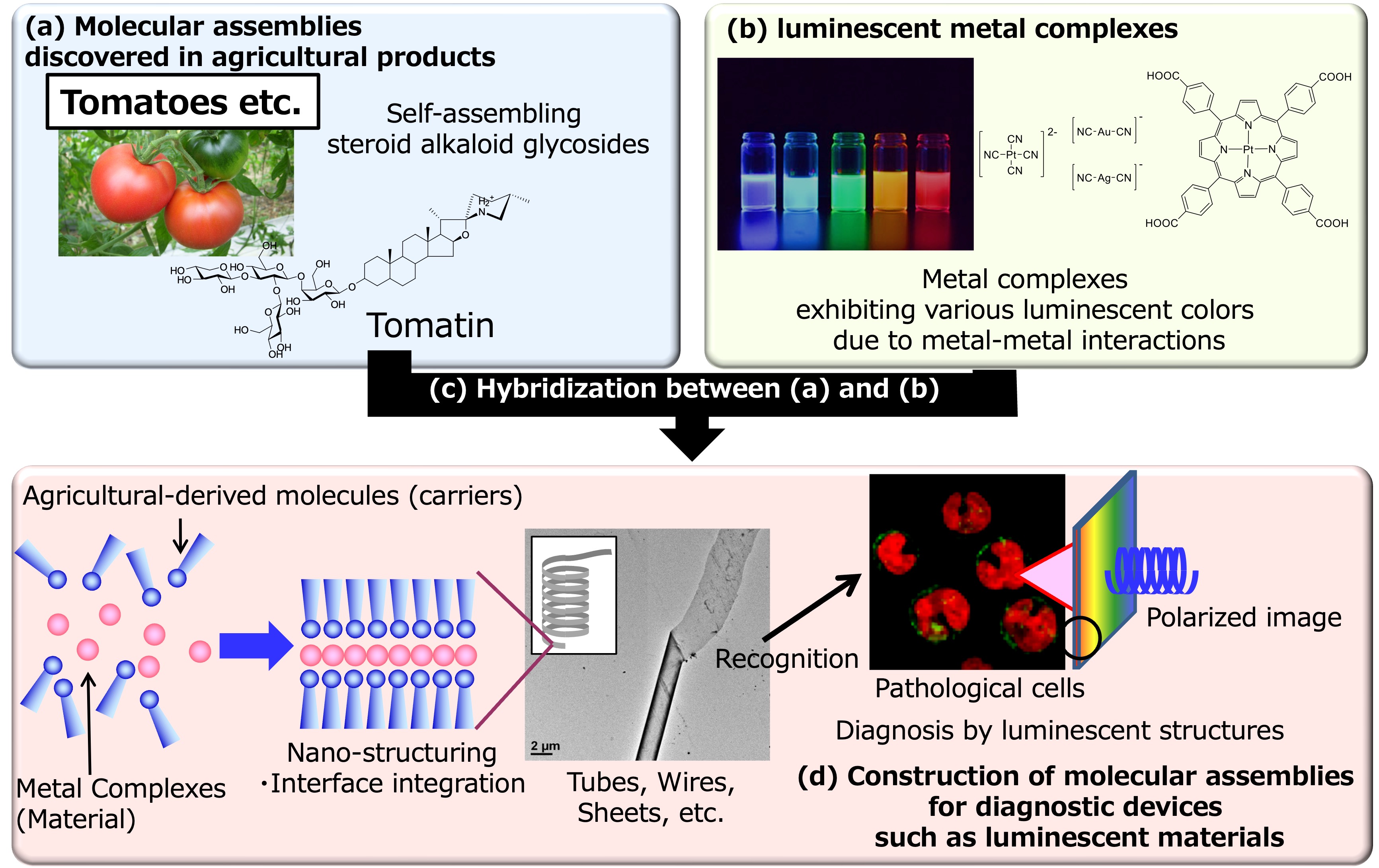 These hybrids form fibrous or rod-like structures and exhibit luminescent properties unique to their nano-organized states. By controlling the assembled structures, applications such as transforming “toxin → therapeutic agent,” regulating bioactivity, or using the materials as bio-labels are envisioned.