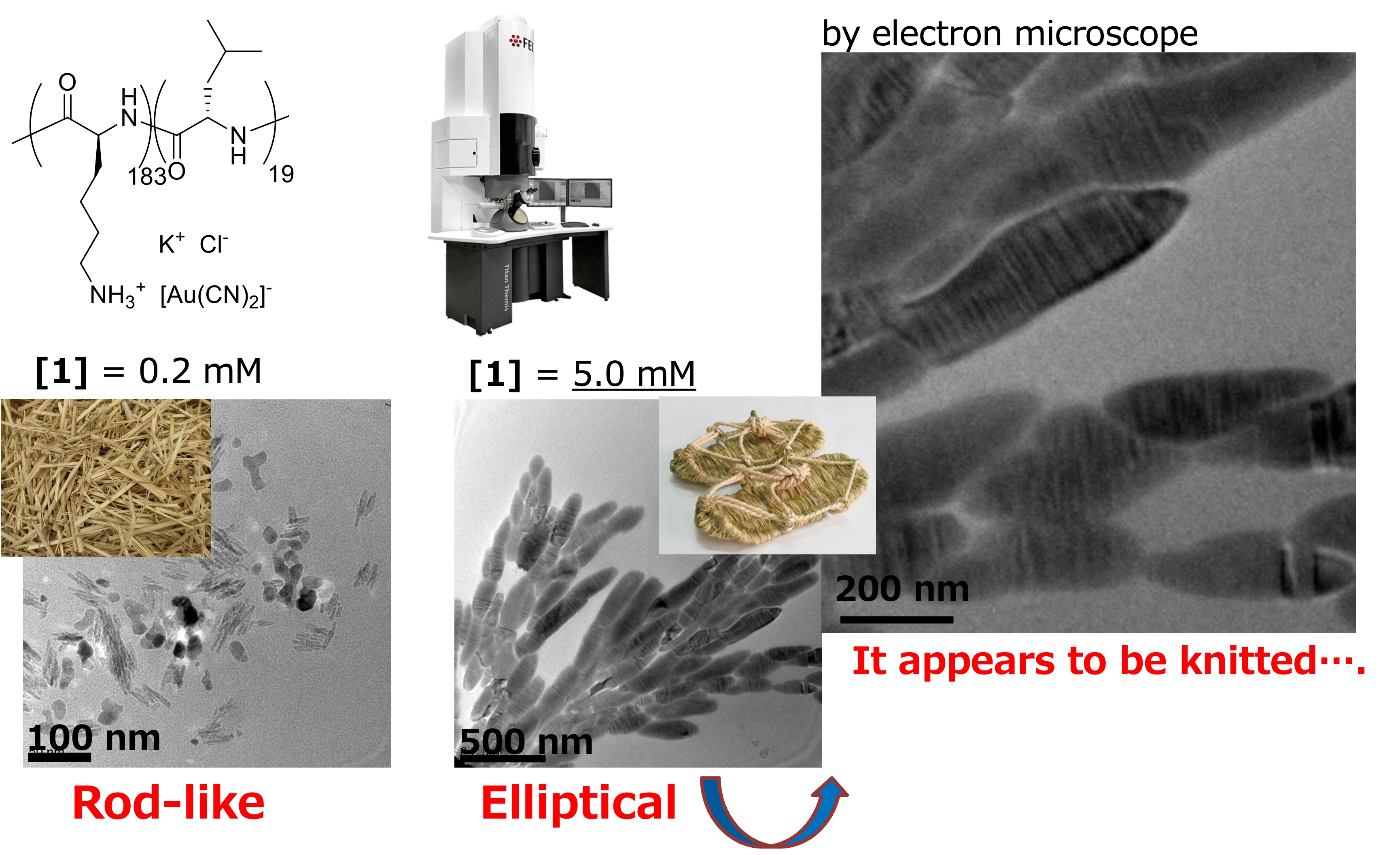Possible morphologies include sheets and three-dimensional assemblies, but we first focus on fibers and thin sheets, which are easier to characterize with electron microscopy. Through repeated experiments, we discovered something intriguing: