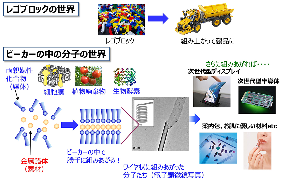 石けんや乳化剤は水の中で油(脂)を溶かしますが、これは石けん分子一個一個の中に、水になじむ部分と油になじむ部分があって、水と油の界面(混じり合わないものが接している境界面)にくっつき、両者を混合させる現象に起因します。界面をつくる物質を一般に「界面活性剤」、専門的には「両親媒性化合物」といいます。「水と油の両方になじむ性質を持ち、両者を仲介する化合物」という意味です。このような両親媒性化合物は、洗剤や化粧品などに使われているだけでなく、私たち動物や農作物などの植物にも、細胞膜、有用成分、タンパク質などとしてたくさん含まれています。この物質をビーカーの中で取り扱い、並べさせるのが今の研究テーマです。導電性や磁性、発光性、生理活性を持つと考えられる物質(金属錯体)をビーカーに入れ、それを両親媒性化合物と混ぜて、画期的なブロック及びその配列状態をつくろうという実験です。もちろん、混ぜた結果、どのような形状ができたか、どのような性質を持つかは、一千万分の一㌢の世界を読み取れる精密分析機器で調べますが、つくり出す工場はビーカー一個なのです。