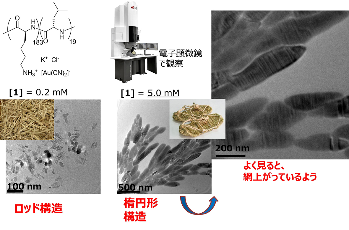 金属―配位子結合が主要な構成要素として構築されるナノ金属錯体の分野においては、金属タンパク質・酵素の活性中心構造や、超分子錯体の素材などとして、様々な最先端研究が行われています。 これらのうち、前者は非常に複雑なアミノ酸配列を有するアポタンパク質によって金属錯体が取り囲まれ、induced-fit特性やアロステリズムに象徴される機能スイッチをもたらす柔軟構造を獲得しています。しかしながら、人工的に両親媒性ポリペプチドを合成すると、金属タンパク質のような複雑な構造を作り出すのは非常に困難です。一方、両親媒性ブロックコポリペプチドは、単純なアミノ酸配列にも関わらず、ファイバー、ベシクル、シートなどの多彩な構造制御が可能です。加えて、金属錯体とのハイブリッド材料を形成すると、金属タンパク質のような高次構造を形成する可能性があります。本研究では、両親媒性ブロックポリペプチドと金属錯体との分子組織性ハイブリッド材料を形成することで、ナノわらじやナノ直方体、ナノ座布団などの、サブナノサイズに整った材料の開発に成功しました。さらにこれらの材料は、発光性や磁性、触媒活性などが発現するナノ部品になることが明らかとなっています。 Yuya Tanimura, Kaito Miyamoto, Takuya Shiga, Masayuki Nihei, Keita Kuroiwa*,